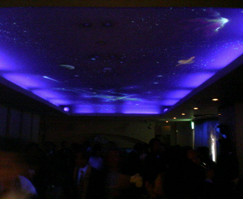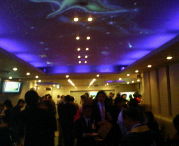 さあ、(株)フルネットの中野社長さんのご発声で、みんなあで北北西を向いて、願いを唱えもって、土佐宇宙酒で「かんぱ〜〜いっ!!」。だんだん暗うなった会場に、その瞬間、ブラックライトの満天の星空が登場!会場のあちこちで、感嘆の声が漏れてきよったがぜよ。
