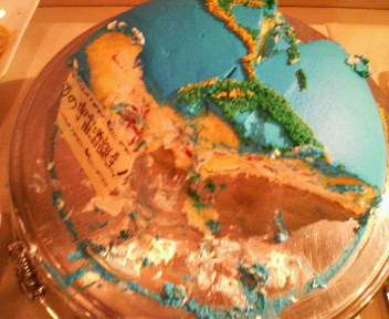 とにかく、地球の形の特注ケーキが現れた時にゃあ、みんなあが感嘆の声をあげて殺到。写真を撮りまくり、アッという間に、地球が半分になっちょったがやき。