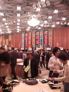 まずは13時までに会場の5階コンコードボールルームに集合。司牡丹は、ワシと営業部長の佐藤さんと営業の渡邊さんの3人が出席したがよ。出展メーカーのミーティングと自社ブースの飾り付けらあを行い、14時半にゃあ、スタンバイ。既に入り口前にゃあお客様の長蛇の列ができちょったがやき。開場の真ん中にゃあ、本部ブースのお燗酒コーナーやお燗グッズコーナー、16種類の「酒屋の前掛け」コーナーらあも、準備万端ながよ。ちなみにこれらあの前掛けや一部日本酒や珍味らあが、開場出口にて限定販売もされるがぜよ。司牡丹も、前掛けや「司牡丹・槽掛け雫酒」(純米大吟醸原酒)や「船中八策」(超辛口・純米酒)、福辰の「酒盗」らあが販売されるがやき。司牡丹ブースの「酒盗」の試食準備もバッチリながよ。