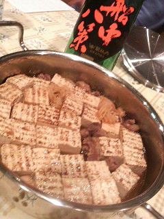途中から、ワシが買うてきた土佐の珍味「酒盗」の徳利入りを出しゃあ、これまた大評判!「船中八策」と交互にやりゃあ止まらんなるっちゅうて、アッという間にのうなってしもうたがやき。