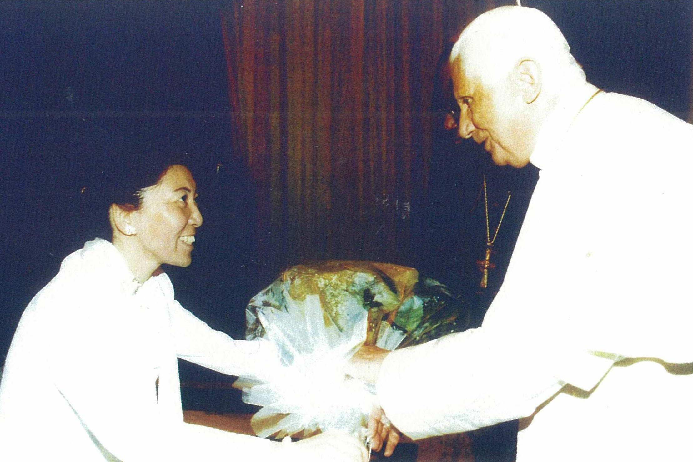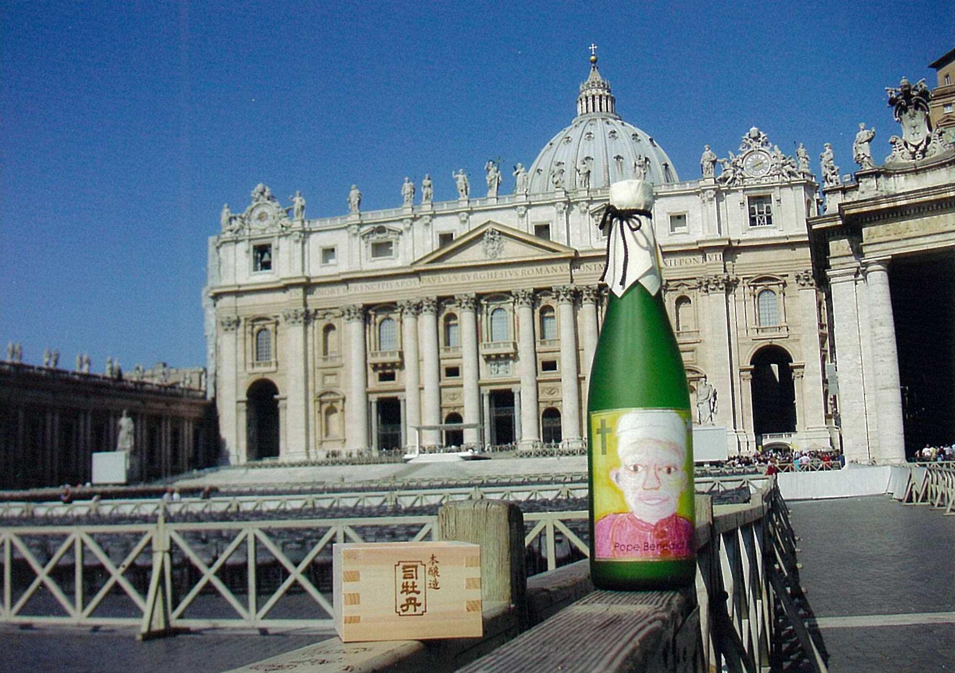 クミコさんは、日本のローマ法王庁大使館でのパーティのすぐ後、その大吟醸酒と司牡丹の枡を土産に、4月28日からバチカン市国を表敬訪問されたがよ。まあ見てちや、この写真!カトリックの総本山、バチカンのサンピエトロ大聖堂の前で、まるで合成写真みたいなばあ見事に、ローマ法王聖下ラベルの「司牡丹・槽掛け雫酒・純米大吟醸原酒」と司牡丹の枡が、光り輝いて写っちゅうがぜよ!ほんでクミコさんは、5月2日にゃあこのお写真の通り、ローマ法王ベネディクト16世聖下にご拝謁の栄誉を賜り、そん時に「ローマ法王聖下ラベル・司牡丹・槽掛け雫酒」をご献上されたっちゅうがやき!聖下は、こぢゃんとお悦びになられたっちゅうことやったがぜよ。こりゃまっこと名誉なことながよ!