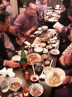 さて途中から梶野さんも加わり、7名にての急遽の忘年会状態。絶品の餃子やメンチカツでビールをいただき、これまたこぢゃんとウマイ玉子焼きやメヒカリやテツ干し(サメの干物)らあで「船中八策」をいただきゃあ、杯も箸も会話も弾んで、盛り上がること、盛り上がること!気がつきゃあ、「船中八策」(720ml)が3本空いちょったがやき。追手筋の酒商ふるや(高知市追手筋1-3-15
