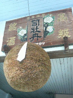 ちなみに「酒林」っちゅうんは、杉の葉で作られた酒屋のシンボルながよ。司牡丹じゃあ、毎年11月中旬ばあの初搾りの頃に、新しいがを自分くで作って吊るすがやき。これっぱあデッカイ「酒林」を作って今でも毎年吊るしゆう蔵元は、全国的にも珍しゅうなってしもうたことと、「酒林」が「栄える」につながるきこぢゃんと縁起がえいっちゅうことで、この「酒林」の下で記念撮影する方々が、結構いらっしゃるがぜよ。また、ケータイのマチウケ画面にもえいのう!実はワシのケータイのマチウケは、今日からこのこぢゃんと縁起がえい「酒林」の画像に変わっちゅうがぜよ。みんなあ、ワシとお揃いにせんかよ〜!ほんでマチウケを見せ合うて、「さかばやし〜〜っ!!」っちゅう合言葉を叫ぶっちゅうんを来年流行らせろうぜや!えいかよ。皆さん、「さかばやし〜〜っ!!」ぜよ!こぢゃんと縁起がえい年になりそうな感じがするろうがよ。よっしゃ!ワシに向こうてコレをやってくれた方にゃあ、その場で何かヒミツのプレゼントを差し上げますぜよ!
