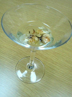 例えば、バラの花をシロップ漬けにしたもんをシャンパングラスに入れ、そこにシャンパンを注ぐと炭酸と共にバラの花が開きもって浮かんでくるっちゅうんがあるがやと。花茶をカクテルグラスにいれるがやったら、例えばそういう演出があったらドキドキして面白いっちゅうがやき。