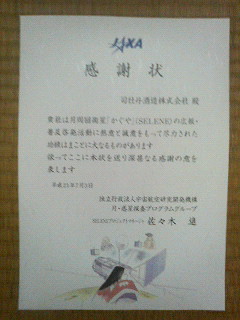 『貴社は月周回衛星「かぐや(SELENE)」の広報・普及啓発活動に熱意と誠意をもって尽力された功績はまことに大なるものがあります