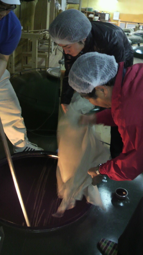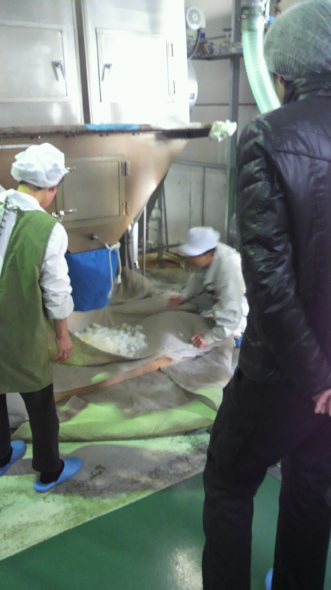 蒸米機と放冷機を通って出てくる蒸米を、2人1組になって布で受け取り、発酵室まで運んで仕込タンクに投入するっちゅう作業を、皆さんにやっていただいたがよ。