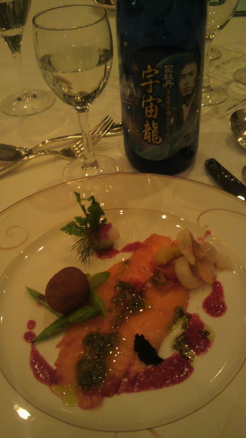 柑橘類とハーブの風味がこぢゃんと豊かなサーモンやツブ貝、毛ガニとタラバ蟹のクロケット、ドライフルーツトマトや秋野菜のピクルス、アンチョビやキャビアと、一皿に様々な味わいがテンコ盛りの冷たいオードブルにゃあ、この酒のフルーティな香りとなめらかな味わいがバッチリやったがよ。