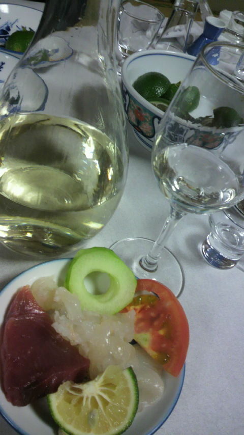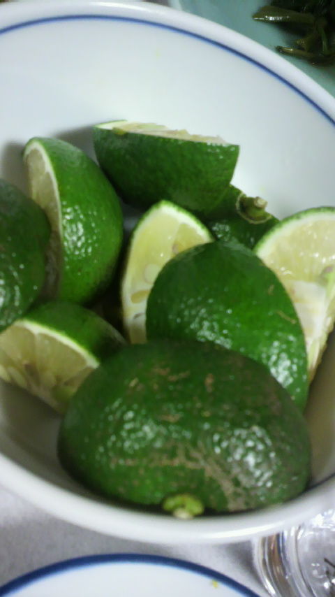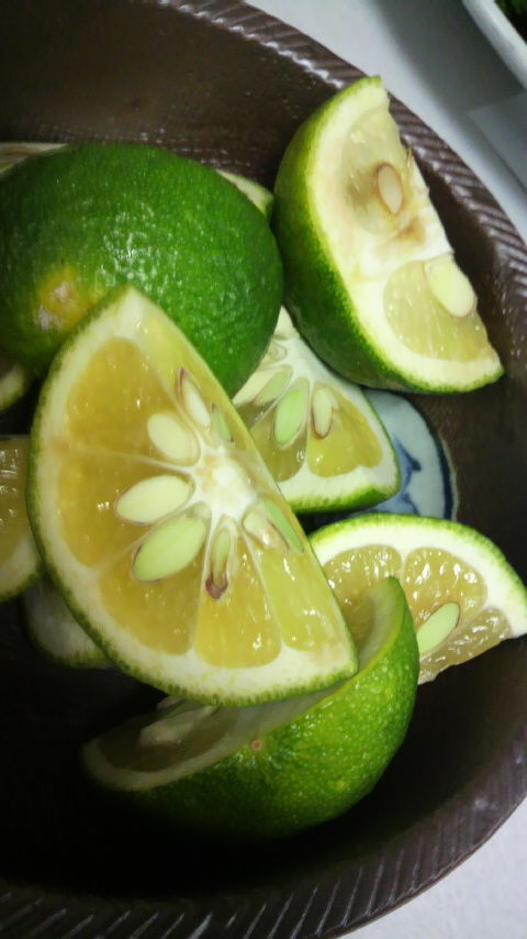 さてモンパエビ騒動の後は、お造りにかける酢ミカン、ブシュカンと直七について、それらあを持ってきてくださったファームベジコ(http://vegeco.jp/)の長崎さんが解説してくださったがよ。