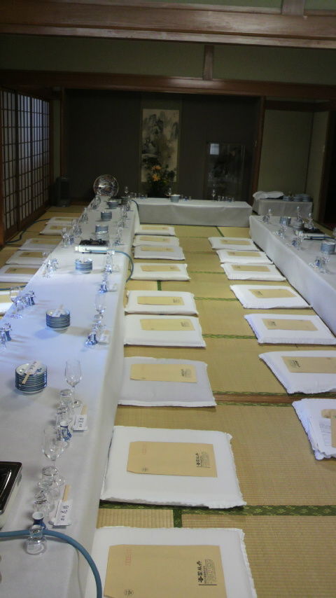 「斗瓶囲い」からカラフェに移し変えられた大吟醸は、皆さんのお手許に配られ、足つきグラスに注がれたがやけんど、その馥郁とした高貴な香りと豊かでありながら繊細さも併せ持つ味わいに、皆さん見事にノックアウト!