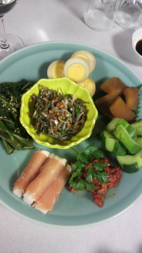 ●「酒菜7種」(ジャコとニンニク味噌和え・生ハム大根ロール・数の子・チャンジャ・煮玉子・長崎さんのクウシンサイのナムル風お浸し・長崎さんの胡瓜の浅漬け)