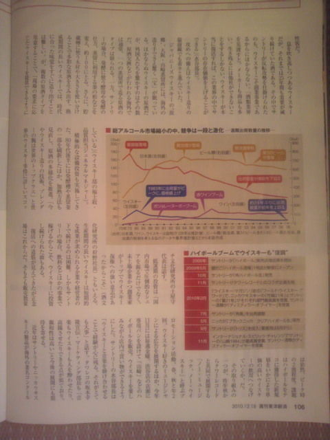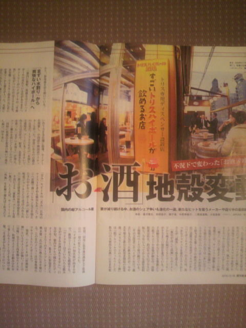 内容は、「不況下で変わったお酒の飲み方」で、日本国内の総アルコール需要が減り続けゆう中、新たなヒットを狙う造り手の最前線を追うっちゅう感じで、8ページにわたって書かれちゅうがよ。