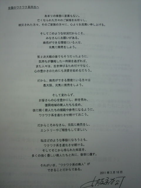 そんな時、ワシのお師匠さんの小阪裕司先生(http://www.kosakayuji.com/)が主宰する「ワクワク系マーケティング実践会」事務局から、ファックスレターが流れてきたがやき。