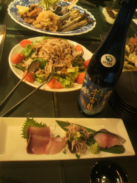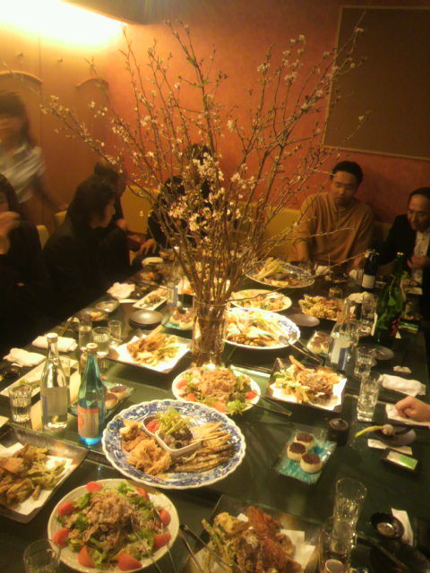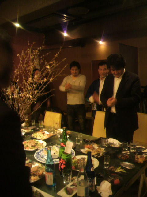 ワシが乾杯のご挨拶をさいてもうて、この酒で乾杯すりゃあ宇宙のパワーが味方して夢が叶うと言われる酒、「司牡丹・土佐宇宙酒・宇宙龍」(純米吟醸酒)で、今回の震災から一刻も早うに復興しますようにとなえもって、みんなあで乾杯して宴席のスタートながやき。