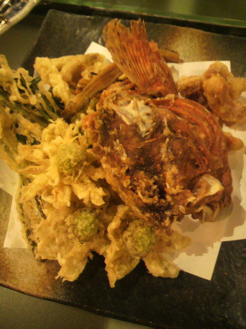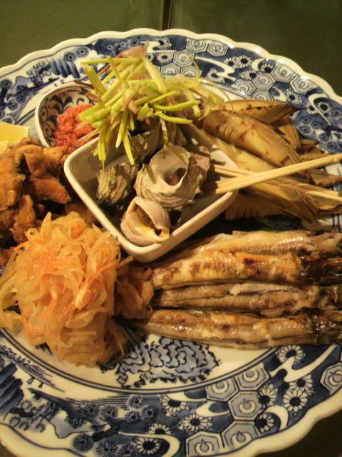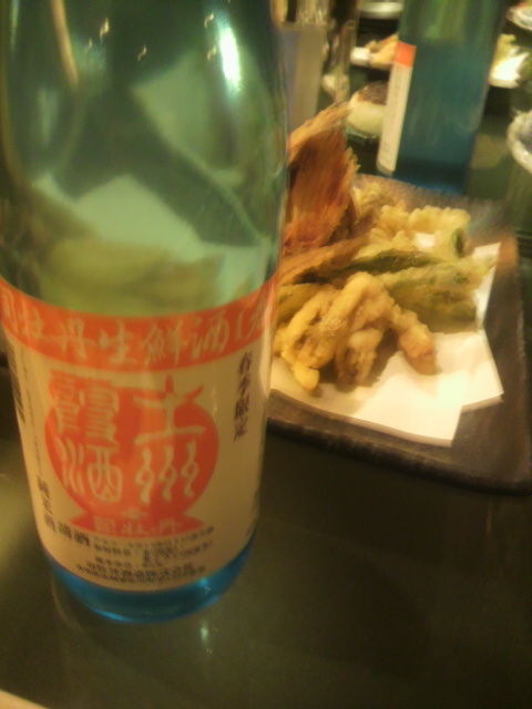 続いては、春限定の旬の酒「司牡丹・生鮮酒〈春〉土州霞酒」(薄にごり純米酒)が出され、お刺身、ニギスの干物、山菜の天ぷら、フキミソの焼きお握り等々をいただきゃあ、杯も箸も進むこと、進むこと!