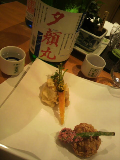 ★「夕顔丸」(吟醸酒)●遊菜:春から初夏 太刀魚・春豆巻き揚げ 茄子・馬鈴薯・ズッキーニ・ピーマン しんじょう揚げ こごみ