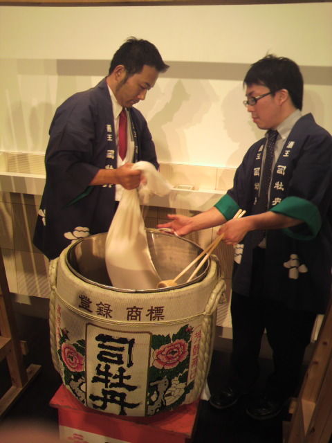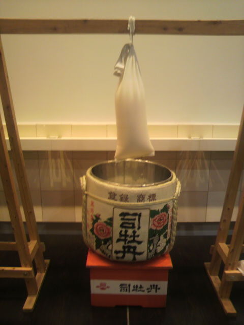 最高ランクの大吟醸酒は「袋吊り搾り」をするっちゅうお話をさいてもうて、後の屏風が開けられ、この日の目玉、「大吟醸・袋吊り今搾り」の登場ながやき!