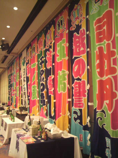 会場の他のくに目を転じてみりゃあ、壁面にゃあ各蔵の巨大なノボリが飾られ、全国各地の名門地酒蔵元ブースが19社と、本格焼酎メーカーと国産ワインが1社ずつの出展やったがやき。