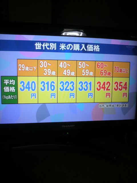 これによりゃあ、米1kgあたりの平均購入価格は、「70歳以上」が354円でトップで、「60歳〜69歳」が2位で342円やっちゅうがやき。